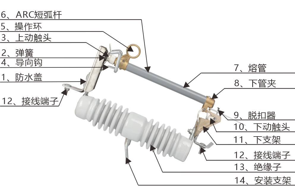 從整體架構來看,跌落式熔斷器主要由絕緣支座、動靜觸頭、熔絲管三大部分構成。